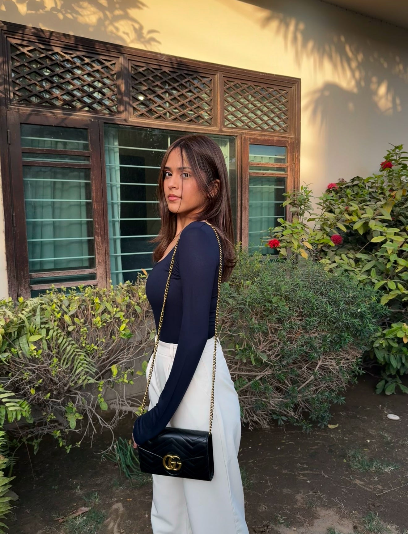 This navy blue fitted bodysuit is made from a soft and stretchy viscose-elastane blend that offers a comfortable and flexible fit.