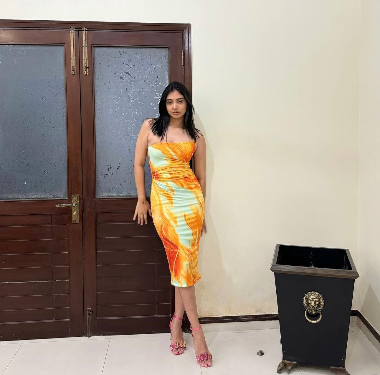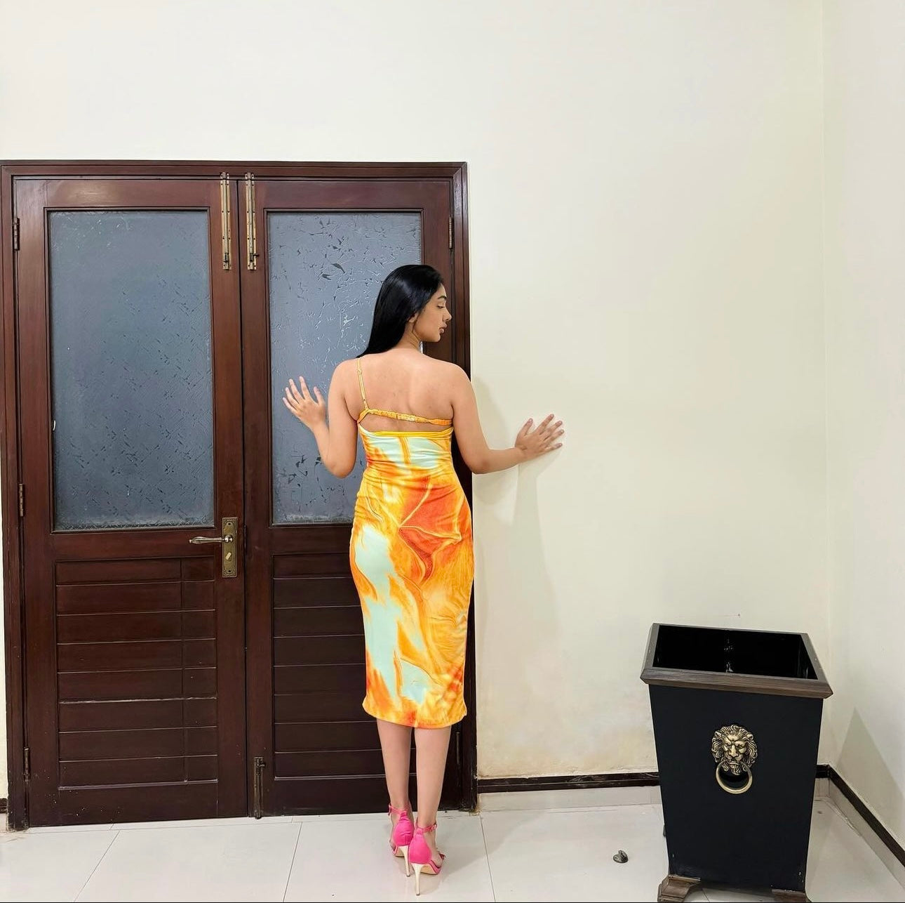 Shop our Orange Printed Fitted Midi One Shoulder Flexible Knitted Pencil Dress, made from polyester. It features a vibrant, predominantly orange pattern with an abstract design. The dress has a sophisticated midi length, and is designed to be form-fitting, accentuating the body’s natural curves. The one-shoulder style, combined with the flexible knitted fabric, adds a modern and trendy touch, making it suitable for various occasions. Model is 5’10 and is wearing medium size.